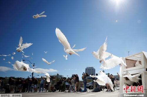 资料图:当地时间2017年10月7日,美国拉斯维加斯市政厅举行活动悼念枪击案遇难者,市政广场放飞白鸽。